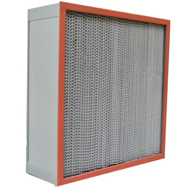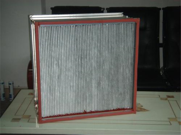 耐高溫高效過濾器使用有隔板設計,波紋形隔板可以精確地保持褶層間距,在最小阻力下,最大限度地利用濾料,過濾器濾材兩面180褶翻褶形褶層,濾料折彎時有兩道壓痕,使其在隔板的尾端開成鍥形盒式褶層,鍥形盒式褶層可以防止濾料破損。閉孔EVA密封墊片可用干氣密性密封,防止過濾器側漏,標準為18mm寬6mm厚。也可采用硅質密封墊片,無隔板高效可使用聚氨酸發泡整體形成,發泡機走XY軸,自動運行,密封效果相當好。